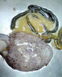 誰か知ってる人いません? 全体的にフニフニしてて、ピンクの所はボツボツ。 潰すと黄色い方から水が噴き出る。。。 キモイwwwww それはとりあえず置いといて、 帰って早速さばきました!!!