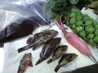 はぅんっイジメタイwwwほいで、昨日の成果!!野菜は釣り行く途中で買ったやつ! 左上ナマコ、下行ってカサゴ2匹、メバル2匹、 左の小さいのオコゼ1匹、ピンクのが大根(?)、右は芽キャベツ! 自分は、カサゴ1、メバル1、オコゼ1を釣った! 後は頂いた!←←← てか、最後に一緒に行った方が釣ったコレ何?wwwww