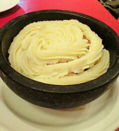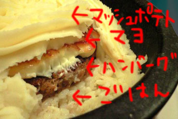 中身は上から、マッシュポテト、マヨネーズ、ハンバーグ、ご飯。