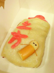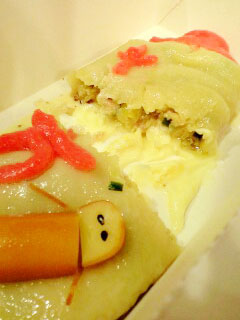 見にくいけど、マヨネーズの形をかたどった餃子。