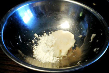 それをすりつぶし、イカ粉末、原材料の中に小麦粉と書いてあったので小麦粉を混ぜ合わせます。