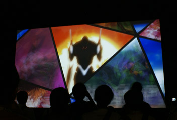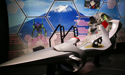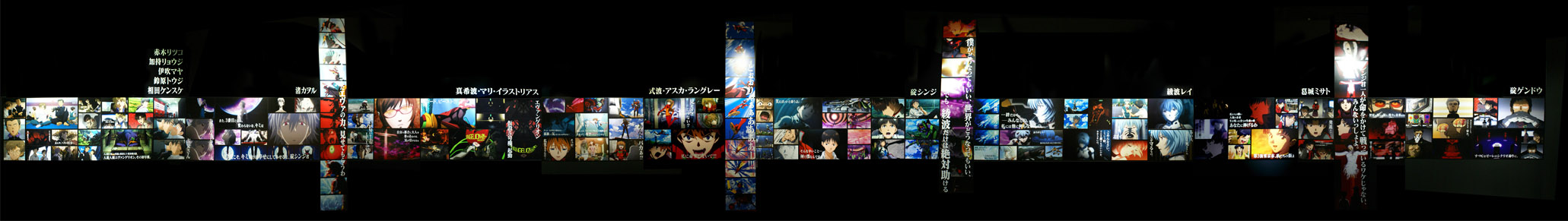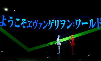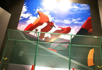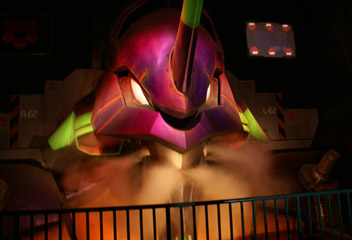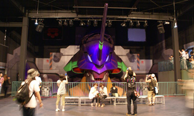最初にシアターに通されて、そこで映画の総集編(?)が見れる! 公開が始まってからは見学方法がどうなるか分からないけど、 画像見て分かるように、ちょっと出遅れると 写真撮るときに人の頭撮れるから注意orz そして、終わったらいよいよ1/1エヴァ見学!!!!!!